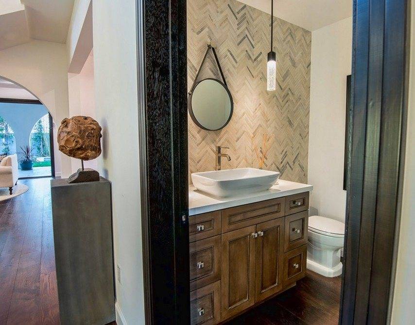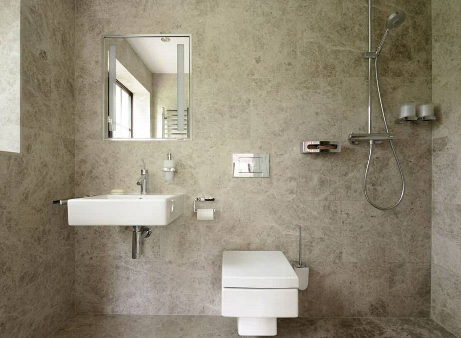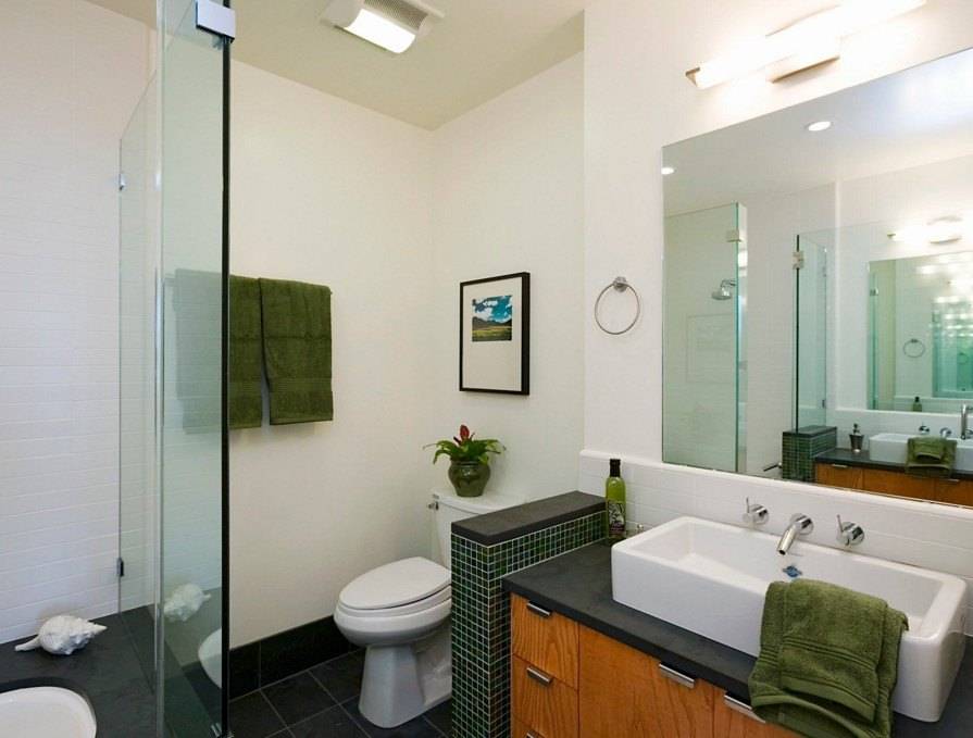 Минимализм. Стиль, идеально подходящий для скромного по площади помещения, сочетает комфорт и функциональную простоту. Вам понадобится компактный светильник (или плафон), зеркало без следов декора и отделочные материалы двух-трех оттенков. Несмотря на видимую простоту, интерьер получается изысканным, во многом благодаря комбинации, включающей серый, коричневый, кремовый, черный цвета. В отделке используются стекло, дерево, камень (натуральный или имитация).