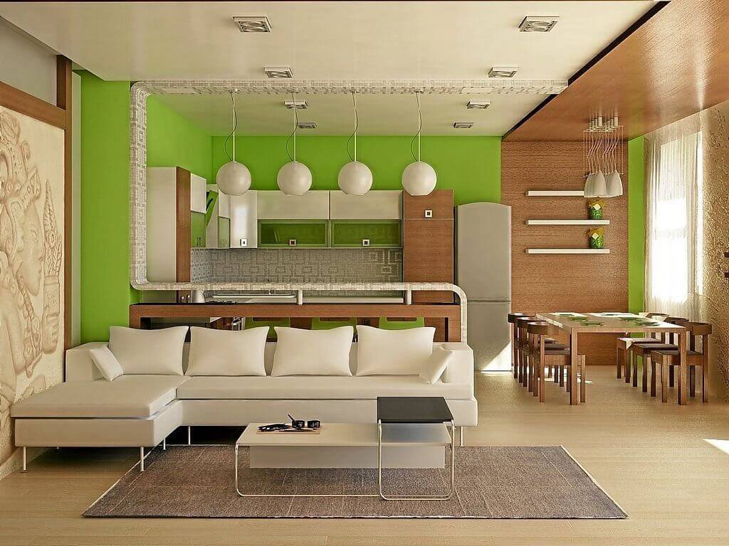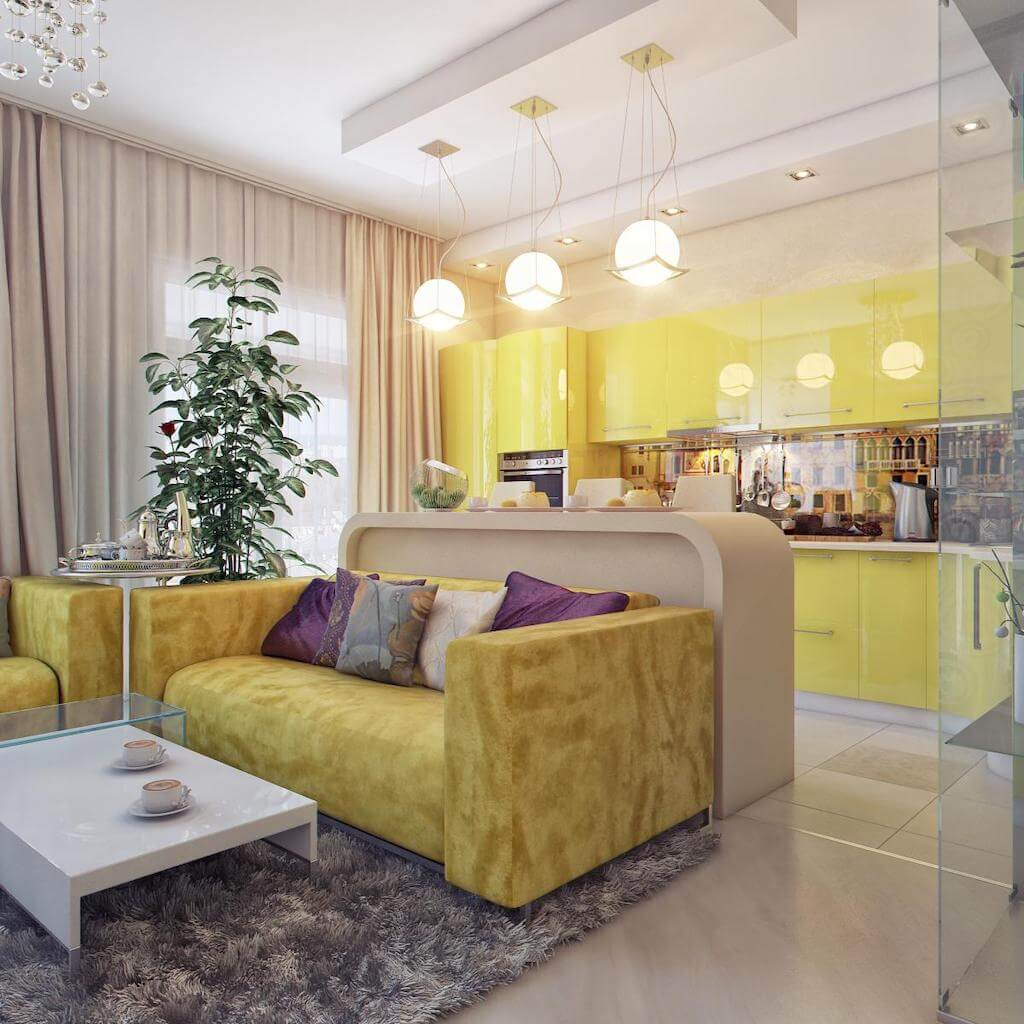 Свет в интерьере кухни-гостиной должен быть равномерным и заполнять всю площадь помещения, не оставляя затемненных уголков. В рабочей и обеденной зоне не должна присутствовать тень. Светильники в кухне-гостиной располагают так, чтобы свет не создавал блики и не раздражал глаза. Для этого следует грамотно выбрать лампы с мощностью, обеспечивающей умеренный световой поток.