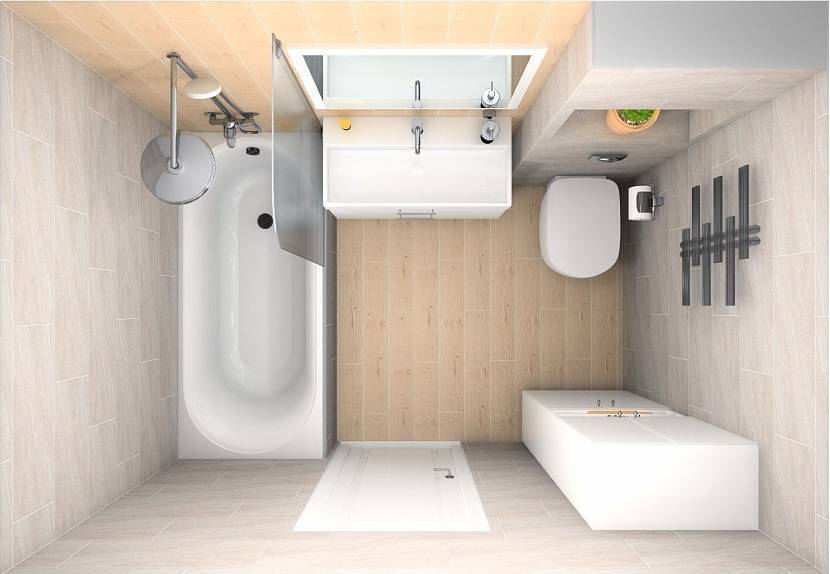 При грамотном планировании в совмещенной ванной можно оптимально разместить сантехнику, мебель и бытовые приборы
