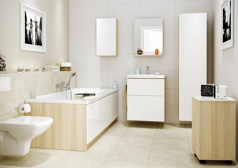 - Современный. Наиболее популярный вариант. Не отличается вычурными деталями и изящными формами. Фасад мебели для небольшой ванной комнаты отличается строгостью. Характерно отсутствие декора. Внутренняя часть мебели должна быть функциональной и практичной: наличие небольших полочек, узких ящичков.