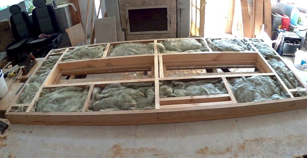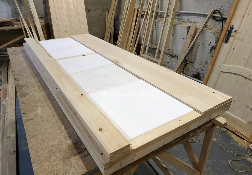 Особенности конструкции: состоят из внутреннего каркаса, который изготавливается с применением взаимно-перпендикулярных сосновых брусков с сечением 40 х 40 мм или 50 х 50 мм. Внутреннее пространство рамы заполняется теплоизолирующими материалами, либо сотовым картоном, после чего с обеих сторон устраивается лицевая отделка из шпона или предварительно обработанной фанеры. А также оргалита с ламинированной плёнкой.