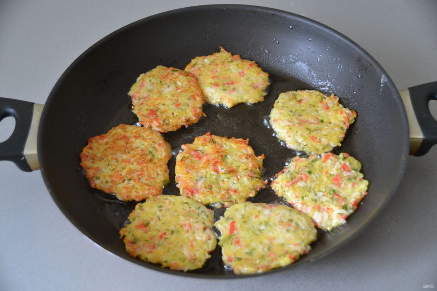 Для начала на мелкой терке натрите крабовые палочки. После очистите и натрите картофель. Соедините все в глубокой мисочке. Вбейте яйцо, добавьте соль и перец по вкусу, по желанию добавьте измельченную зелень. Все тщательно перемешайте. Если масса жидковата, всыпьте 1 ложку муку.