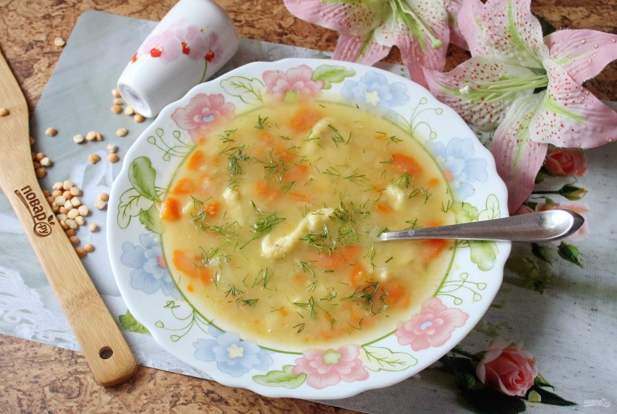 Параллельно очистите и измельчите лук и морковь. Обжарьте овощи на сковороде с растительным маслом. Картофель очистите, нарежьте кубиками и выложите в кастрюлю к немного мягкому гороху. Посолите, добавьте любимые специи для аромата и варите минут 10. После добавьте жареные овощи и продолжайте варить.
