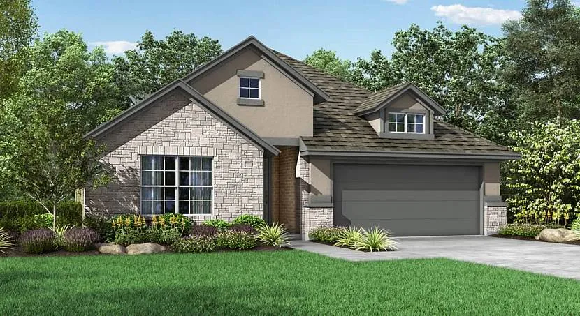 Для этого частного дома использовали совмещение дерева, штукатурки и натурального камня
