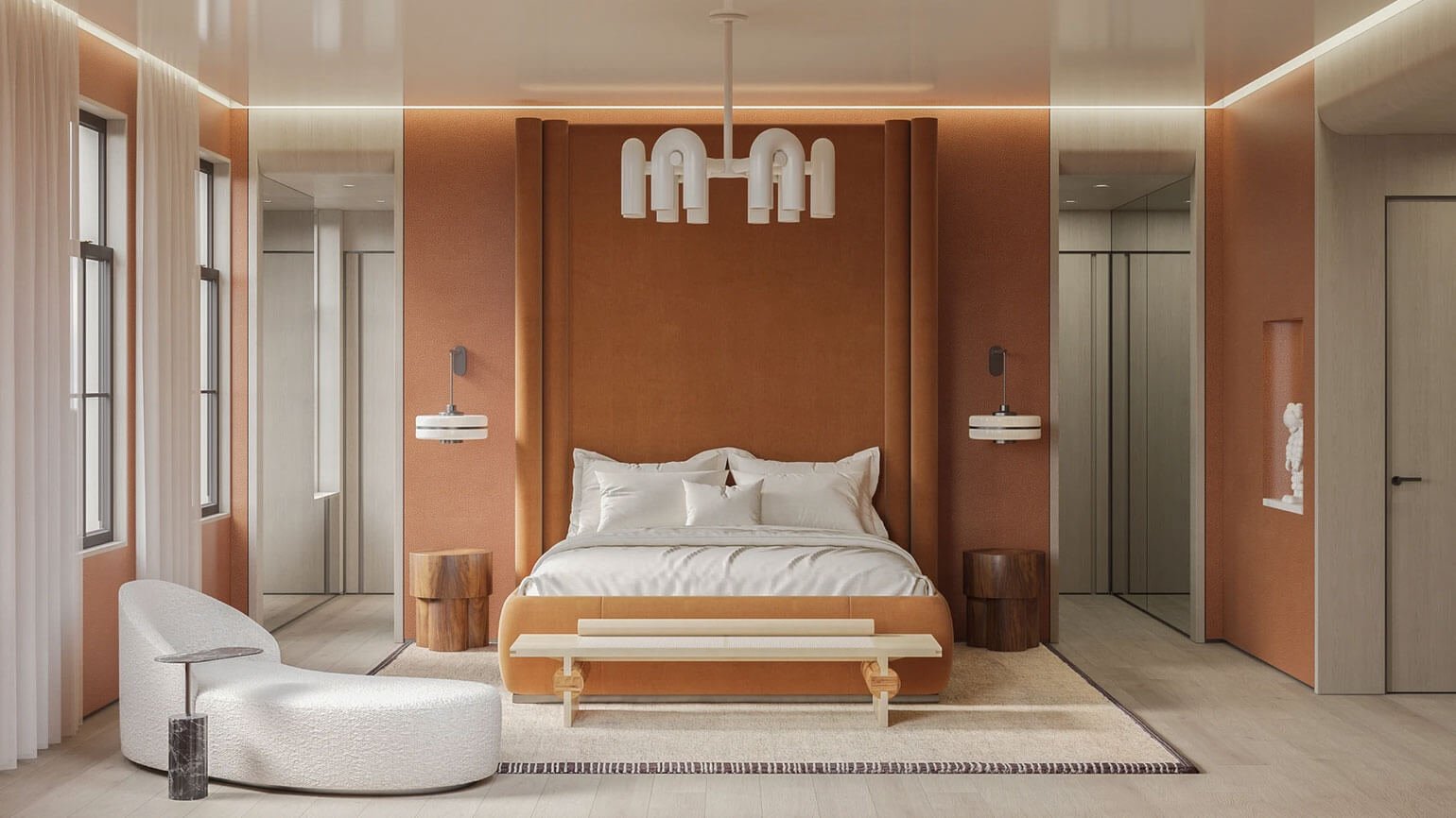 Бархатное изголовье в высоту стены, обои с фактурой замши, натуральное полированное и просто шлифованное дерево, обивка кушетки с рельефом глубоким, как у каракуля. Текстуры делают интерьер тёплым, но при этом не пёстрымИзображение: Nainoa
