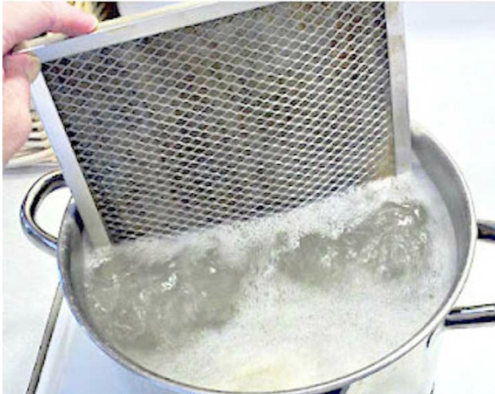 Трудоемкие засоры можно выварить. Метод подходит для решетки и фильтра (угольные разновидности нельзя мочить). Поместите деталь в термостойкий тазик или ведро, заполните водой с добавлением стружки хозяйственного мыла