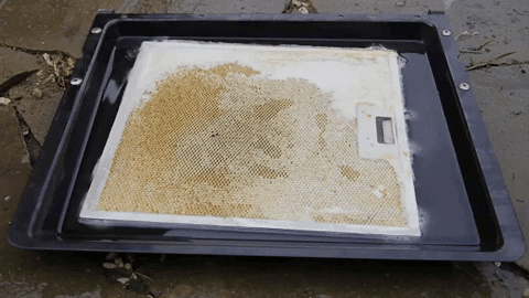 - Поместите решетку вытяжки в противень и залейте его кипятком/горячей водой (она должна слегка покрывать фильтр).