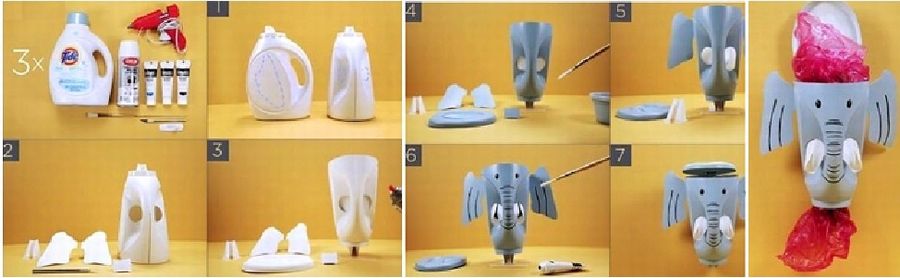 Очень креативная пакетница из пластиковой бутылки из-под моющего средства. Вот как превратить пластиковую емкость в игривого слоненка.