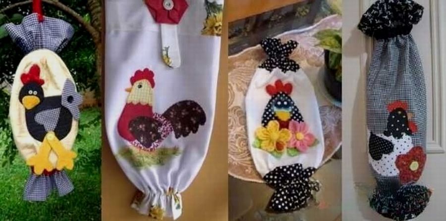 Пакетницы с курами и петухами. Здесь изображения птиц нашиты или наклеены на мешочки для пакетов. Сами мешочки тоже оформлены в «курином» стиле.