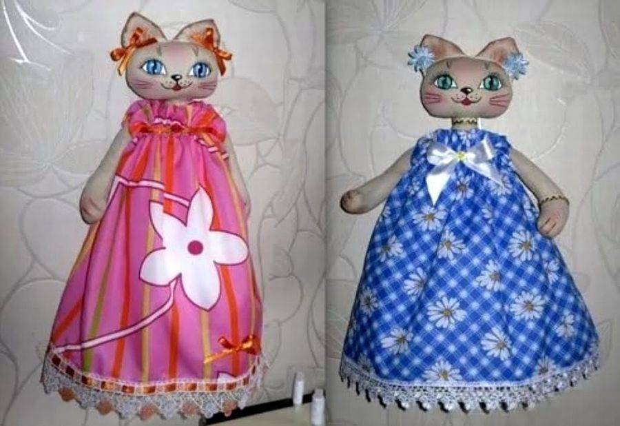 Пакетница кошечка делается так же как и пакетница кукла, но тут встает вопрос выбора материалов. При желании сэкономить ткань, мешочек для пакетиков лучше делать из старых колготок.