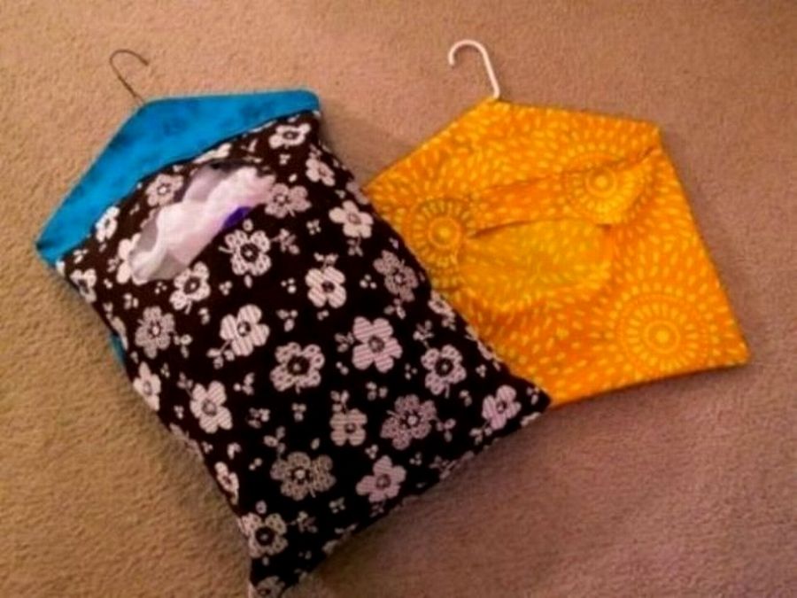 А тем, кто заботится об окружающей среде, понравится экологичный тканевый мешок на плечиках. Всё гениальное просто! Берём плечики, отрез ткани и всё необходимое для шитья. Конструкция состоит из чехла для плечиков и двойного прямоугольника с отверстием сверху. Все детали сшиваем между собой и наполняем содержимым.