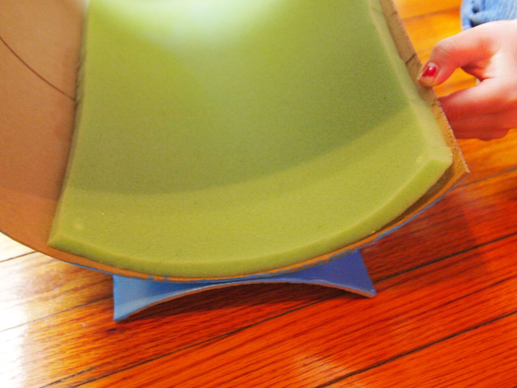 После того, как форма будет готова, обклеиваем ее ковролином. Чем жестче будет ковролин, тем лучше. Чтобы домик для кошек был устойчивым, можно приклеить основание к куску фанеры.
