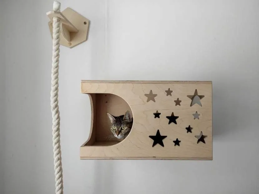 - Дополнительные «устройства» для физических упражнений. Игривые коты нуждаются в месте, где можно выплеснуть свою энергию. Установите вместе с крытым домиком дополнительные столбы со столешницами, обвитые бечевкой. Такие домики можно встретить и в продаже в специализированных магазинах, но их стоимость может превышать допустимый семейный бюджет семьи. Их легко сделать самостоятельно из фанеры и прочих стройматериалов.