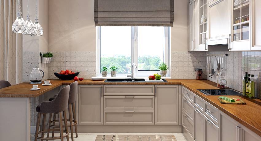 В случае если подоконник находится на более высоком уровне, чем столешница, отступ между верхней и нижней конструкциями зачастую декорируют посредством плитки либо закрывают с помощью плинтуса. Какой именно вариант будет выбран, зависит лишь от особенностей кухонного дизайна. Говоря о широких подоконниках в интерьере, стоит заметить, что их изготавливают из такого же материала, что и столешницу. При этом они служат дополнительными полочками. Если принимается решение оставить подоконник в первоначальном варианте, его урезают до значения ширины откоса.