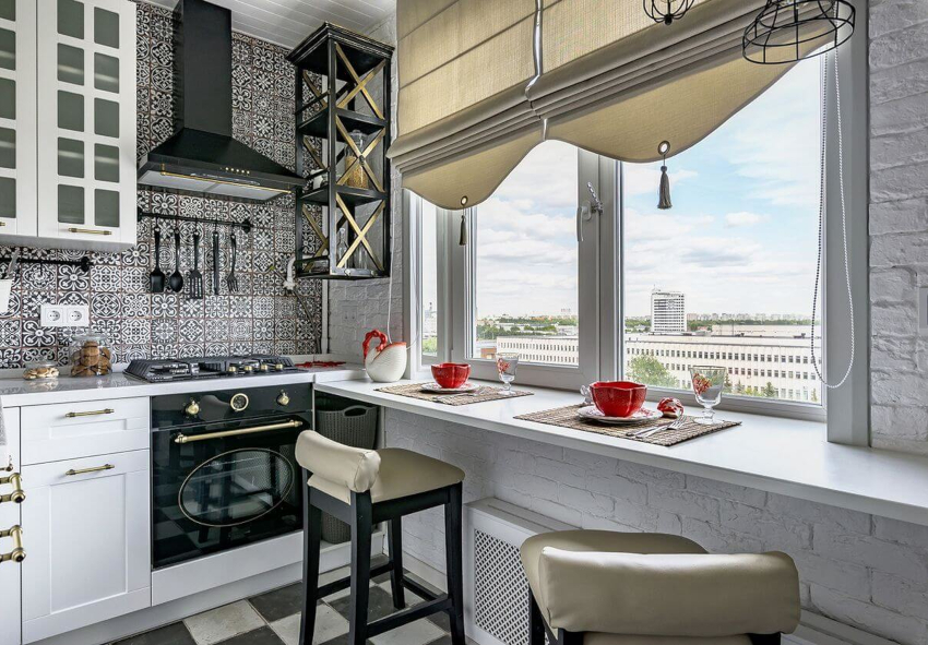 Это может быть интересным и удачным решением, особенно в малогабаритных кухнях, где ценится каждый сантиметр площади. Не стоит забывать тот факт, что при правильном подборе сочетаний цветов, размеров, фактур, крупный подоконник и большое окно визуально расширяют объем небольшого помещения.