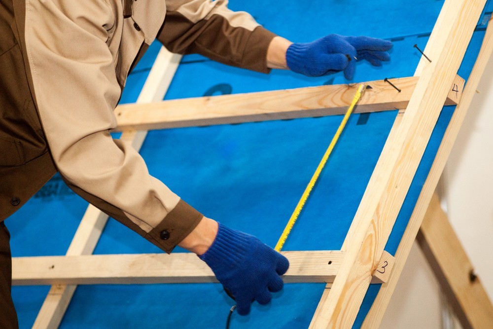 Укладывается на стропильные ноги. Желательно предварительное обустройство гидроизоляции: на стропильных ногах укладывают полосы гидроизоляционной пленки, закрепляют их брусками контробрешетки сечением 0,5х0,3 см. Поверх монтируются обрешеточные плиты. Их толщина — от 1-1,2 см. Укладывают их в перпендикулярно стропилам в шахматном порядке, чтобы стыки плит в рядах не совпадали. Между плитами обязательно должен остаться деформационный зазор в 3 мм.