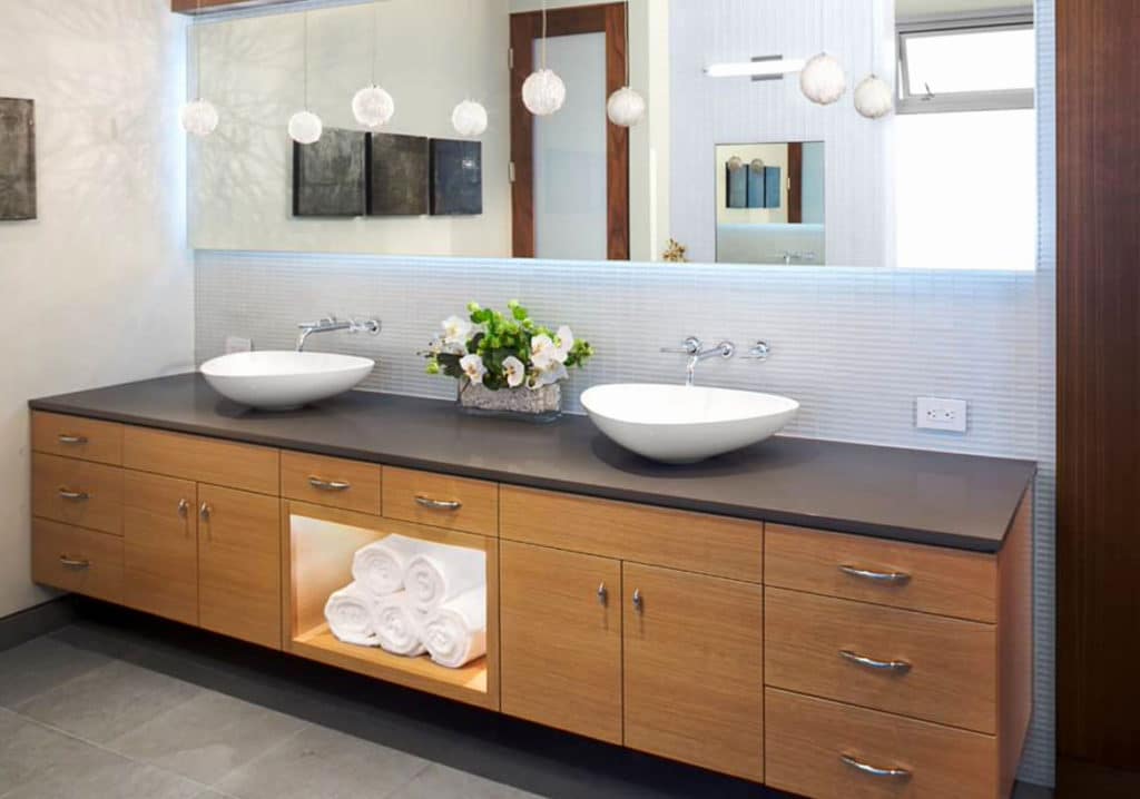 На стене возле раковины также не помешает одна розетка для фена, плойки, электробритвы и др. В большом количестве розеточных точек нет смысла, достаточно будет 2-3 штуки. Учитывайте, что в открытую фурнитуру может попасть вода. Расстояние от раковины, ванны или душевой кабинки до розетки должно быть не меньше 60 см, для мелких приборов точку делают внизу, удаленную от пола не меньше, чем на15 см.