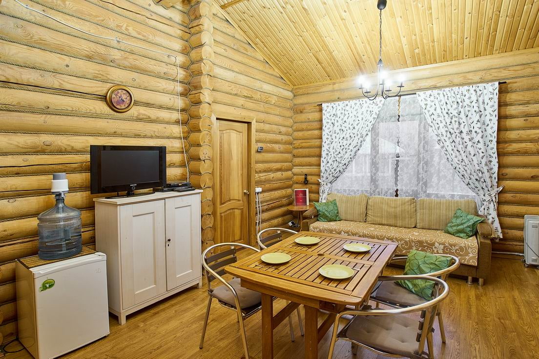 На фото дизайн зала в срубе