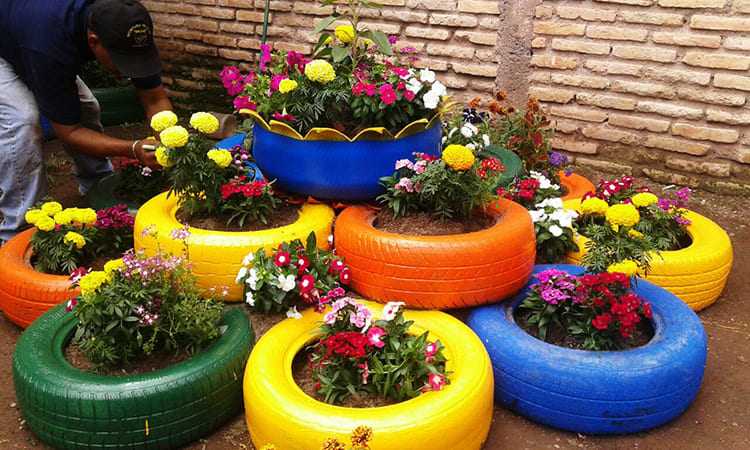 Цветник из старых автомобильных покрышек