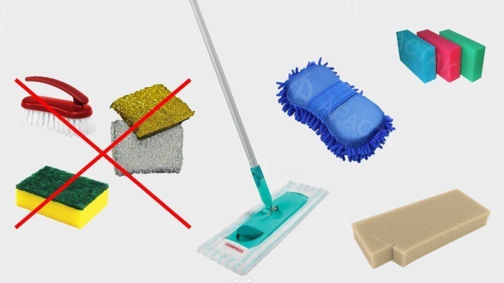 - Щадящие ткани, салфетки, губки. Приспособления не должны быть маркими. Лучше не использовать резиновые экземпляры – они станут тянуть глянцевую пленку. Предварительно проверяется отсутствие порошковых веществ даже в малом количестве. Не подойдут варианты с каймой, кисточками или другими видами орнаментации и декорации. Хорошим выбором станет специальная метёлка.