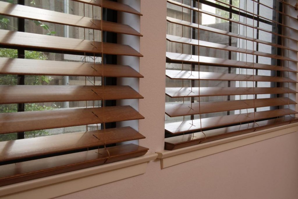 Деревянные. Конструкции из соединенных веревкой деревянных планок (размеры последних могут быть разными). Такие жалюзи являются обычно горизонтальными, но существуют и вертикальные варианты с широкими планками. Изначально выпускались из натуральной древесины, однако сейчас применяют альтернативный вариант – искусственное дерево, сочетающее в себе синтетические и натуральные компоненты. Такие современные жалюзи вполне могут использоваться в помещениях с повышенным уровнем влажности.