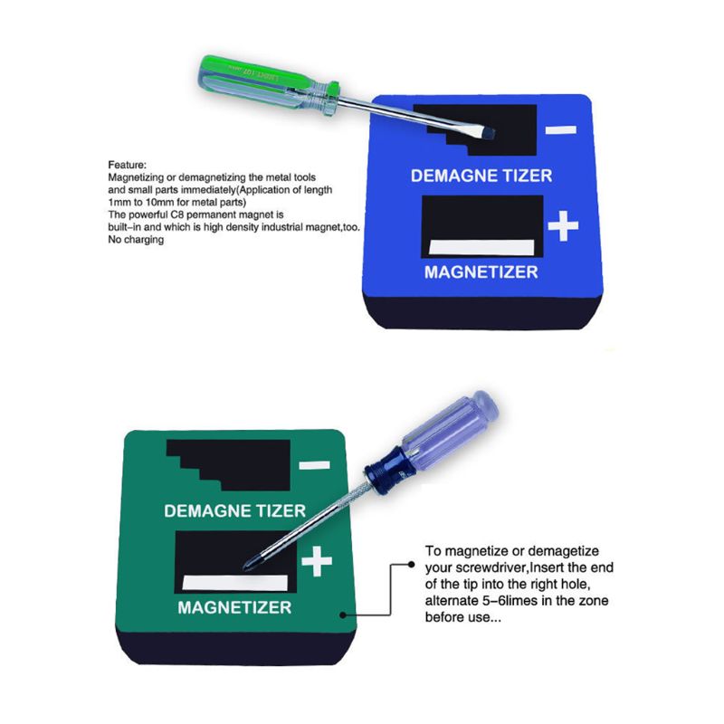 Использование приборчика не требует подключения к сети, специализированных знаний и навыков. Состоит из полимерного корпуса, в котором размещены два магнита. Имеются две прорези, рядом с каждой – обозначающие надписи. Для того чтобы намагнитить отвертку, нужно поместить ее на непродолжительный период в соответствующее отверстие, в то время как для размагничивания понадобится другое.