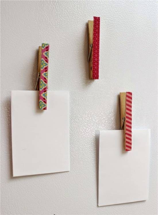 А еще деревянные прищепки могут удерживать кусок бумаги на дверце холодильника и в то же время зажимать что-то между зубцами.