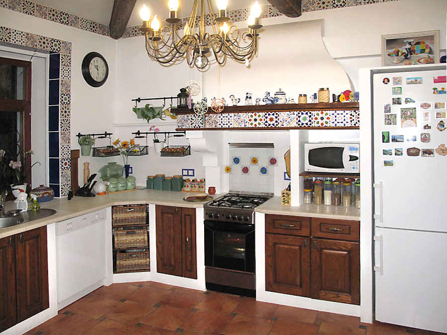 После ремонта остатки плитки есть почти у каждого. Много материала для этого способа не понадобится, потому даже покупка нового кафеля не ударит по бюджету. Плиткой, естественно, выкладывают не все фасады. Фрагмент с красивым рисунком можно приклеить по центру. Это может быть одна плитка или же четыре плитки поменьше, выложенные в форме квадрата или ромба. Мелкой плиткой можно выложить контуры шкафчиков. Часто такое украшение используются для декора нижнего или верхнего края гарнитура. Изображение на плитке должно соответствовать общему стилю кухни.
