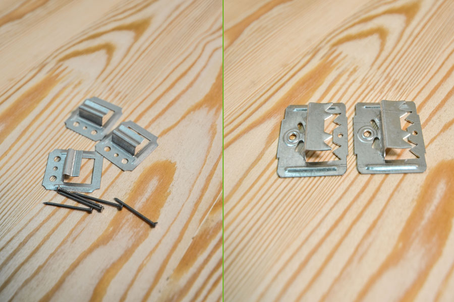Кляймеры позволяют установить вагонку, полностью сохранив ее целостность. Они представляют собой металлические пластины с язычком и отверстиями. Язычок предназначен для удержания вагонки, а благодаря отверстиям кляймер прикрепляется к каркасу. Такие простые, но в то же время гениальные, крепежные элементы позволяют выполнять скрытую фиксацию вагонки – снаружи никаких креплений видно не будет. Древесина при этом защищена от трещин, которые могут появиться при вбивании в нее гвоздей, а весь процесс монтажа достаточно несложный.