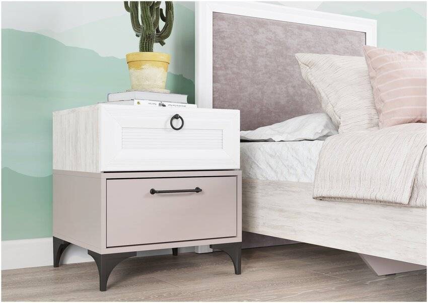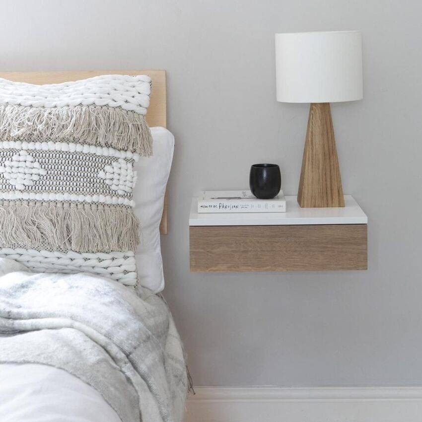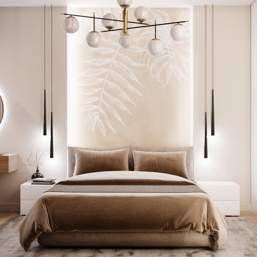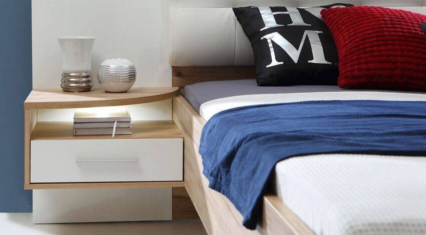 По бокам могут располагаться прикроватные тумбочки, которые при необходимости можно заменить на подвесные полки. Такой вариант поможет сэкономить пространство и будет выглядеть более оригинально.