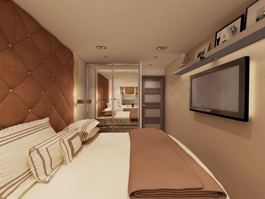 Такая форма спальни характеризуется необходимостью использования приемов, позволяющих раздвинуть границы стен и увеличить размеры помещения.