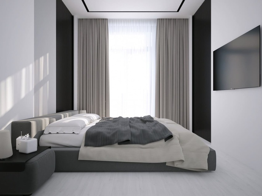 Узкие спальни такого типа обычно оформляются в современном стиле, характеризующимся отсутствием вычурности и лаконичной цветовой палитрой.