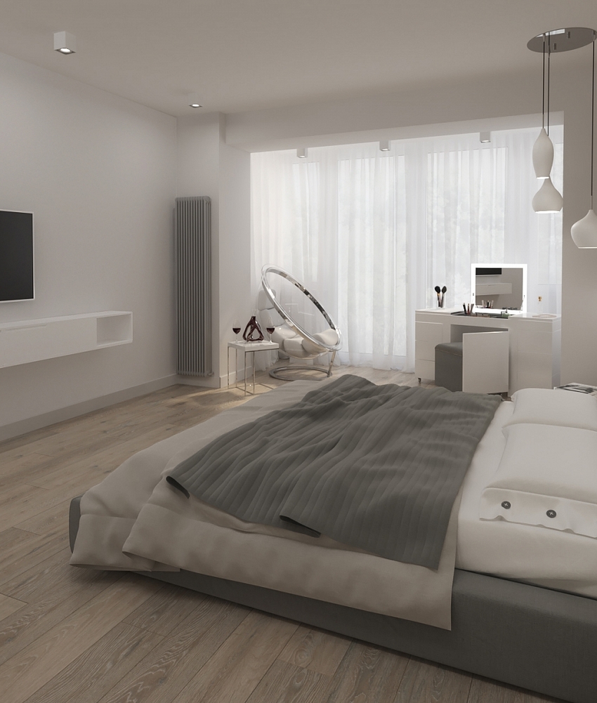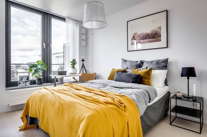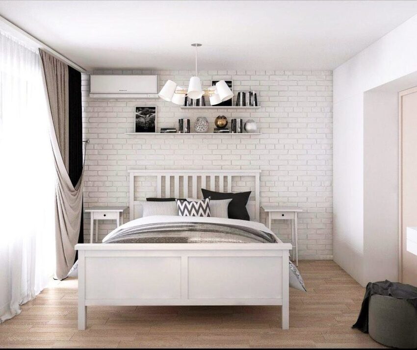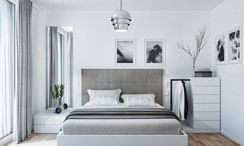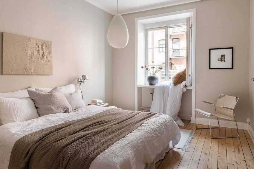Наиболее подходящим стилем для небольшой комнаты является минимализм. Его лаконичность в декоре, мебели и текстиле поможет избежать загруженности спальни.
