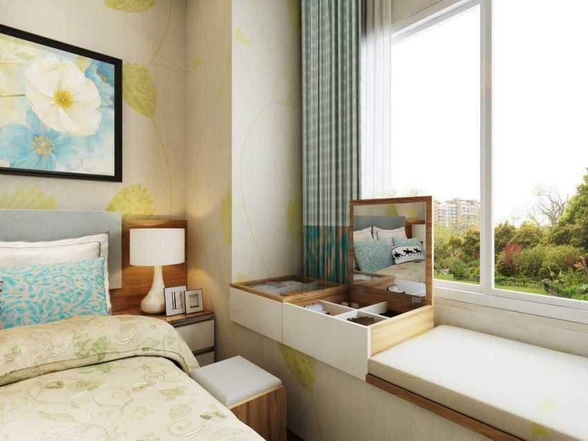 Прочее пространство комнаты, куда попадает естественный солнечный свет, нужно отвести под туалетный столик или рабочую зону.