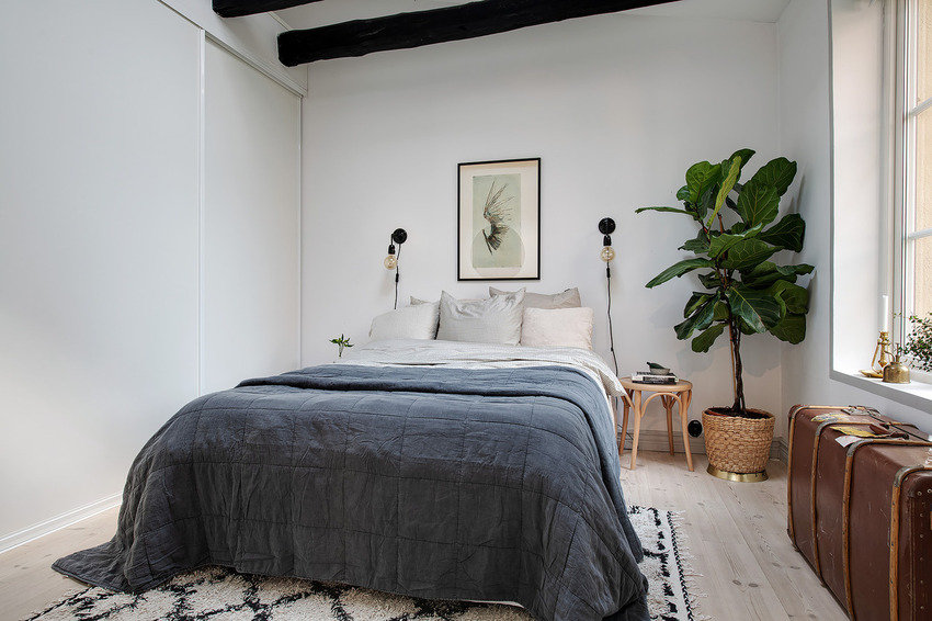 Скандинавский подход придется по душе ценителям и минимализма, и домашнего уюта. Натуральный текстиль, деревянная мебель, комнатные растения прекрасно впишутся в сканди-спальню.