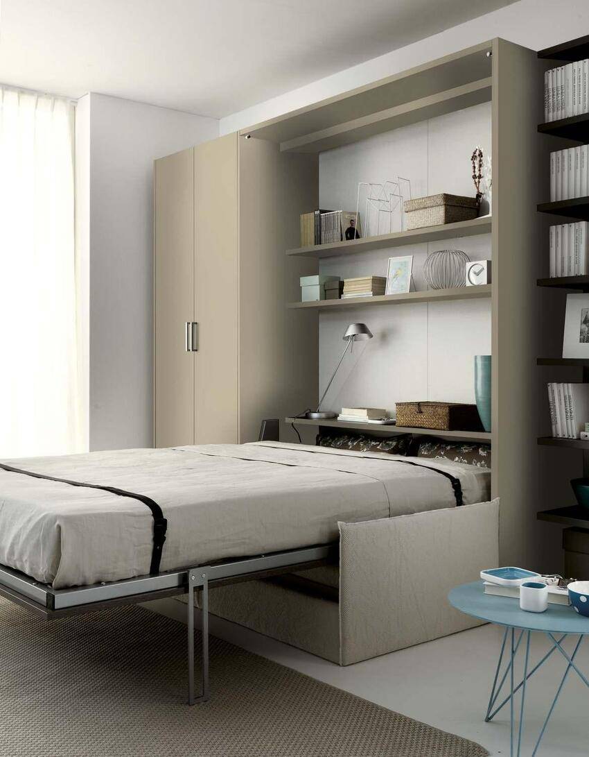 Использование такой конструкции позволяет забыть о прикроватных тумбочках, которые в узких спальнях занимают много пространства. Вместо них в спальне можно установить маленький туалетный столик в освободившемся месте.