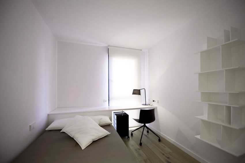 Спальня и место для работы. В этом случае место для сна располагают у окна, на котором будут висеть шторы, не пропускающие дневной свет. Рабочее место напротив оборудуют около входной двери, предусмотрев качественное искусственное освещение. Для разделения пространства можно использовать книжные стеллажи небольших размеров, которые станут частью дизайна.