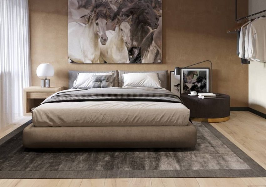 У кровати стоит разметить мягкий коврик с асимметричным геометрическим рисунком. Такой метод позволит визуально увеличить пространство. Не рекомендуется в спальне использовать броские предметы декора – обстановка должна быть спокойной.