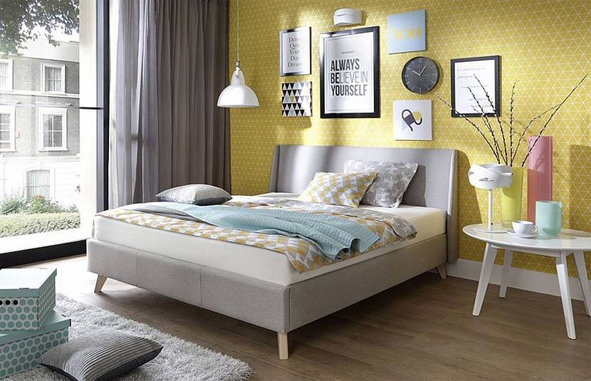 - Отделка. Для оформления стен в спальне 14 кв. можно использовать обои, краску, деревянные панели – всё зависит от вкуса владельца. Сегодня в тренде необычные изголовья, которые стало модно украшать оригинальными деталями: состаренными досками, яркими обоями, грифельной краской. По-прежнему популярны покрытия для пола «под дерево», которые ценятся за придание интерьеру природных ноток.