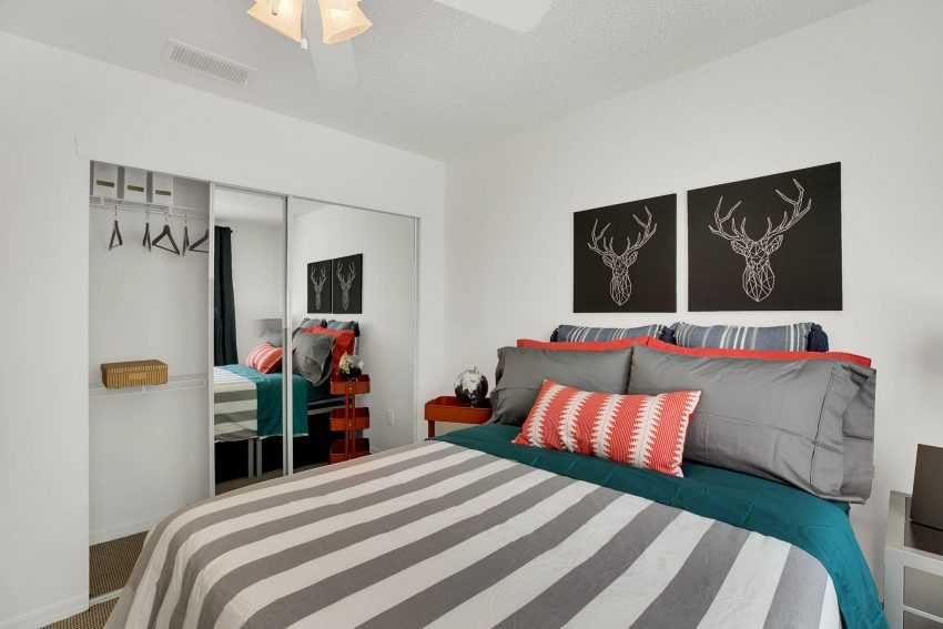 Расстановка мебели в спальне должна быть достаточно компактной. К примеру, единственная конструкция, которая включает в себя сразу гардероб, диван, складную кровать и письменный стол станет прекрасной находкой. Она займёт только одну часть комнаты и предоставит изобилие функций.