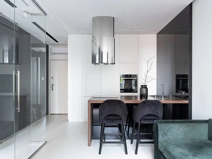 Зона кухни выполнена в виде буквы «П». Это современный встроенный гарнитур черно-белого цвета, оснащенный всей необходимой бытовой техникой. Здесь в продолжении столешницы оборудована столовая зона.