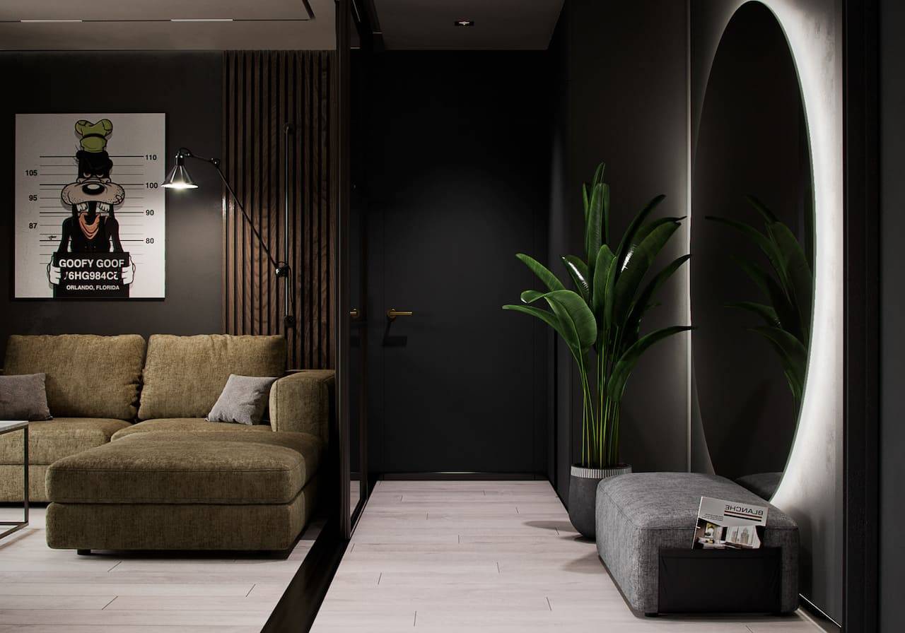 - установлен диван, который может визуально обозначать территорию отдыха;