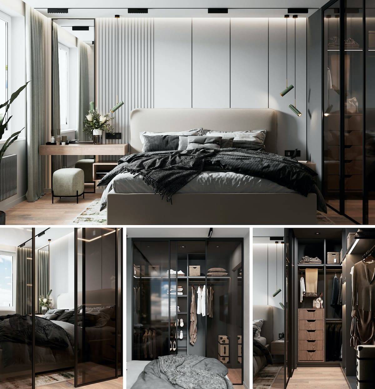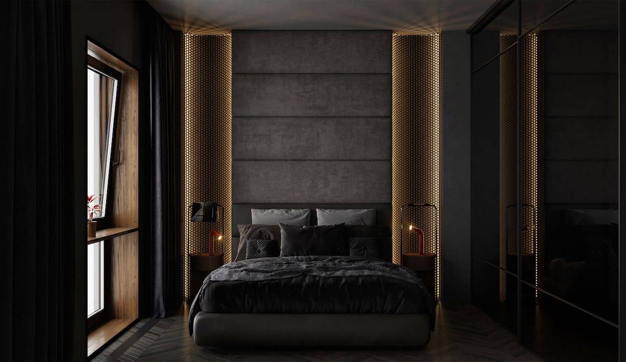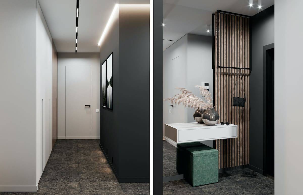 Еще одна прекрасная идея, которая является несколько неожиданной, но от этого не менее функциональной – П-образный гардероб, обрамляющий дверь. Занимая бесполезную зону над дверным проемом и по его бокам, вы сможете убит сразу трех зайцев: во-первых, получится выделить для себя полезное пространство. Во-вторых, существенно сэкономить финансовые средства, потому что цельный шкаф уже не понадобится. В-третьих, визуально сделать комнату шире, зрительно оптимизируя ее пространство.