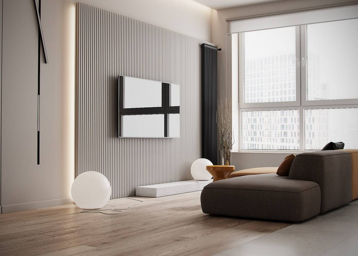 Штукатурка для стен в гостиной может быть изготовлена из деревянных или гипсовых ламелей, которые просто прилипают к декорированной поверхности. Планки должны создавать симметричную, хорошо продуманную композицию (состоящую из прямоугольников и квадратов). Штукатурка будет выглядеть лучше, если она будет окрашена в тот же цвет, что и стена.