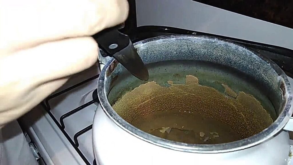 Кислоты и агрессивные препараты разъедают покрытие. Очищающей жидкостью наполняют емкость, доводят до кипения и держат на огне 20 – 25 минут. После охлаждения растворенный осадок счищают мягкой губкой или щеткой.