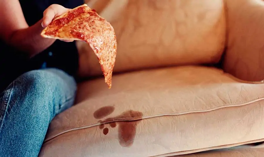 Для удаления свежего жирного пятна, его присыпают толченым мелом, тальком или солью на 2 часа. Затем порошок сметают и чистят диван простым способом.