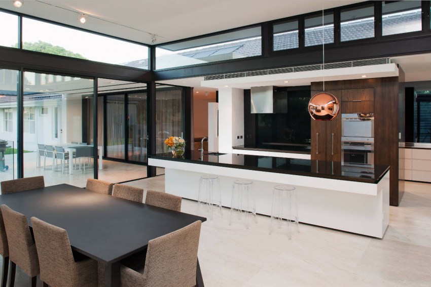5. Объединив кухню с гостиной, вы получите удобное открытое совмещенное пространство со свободной планировкой, где много света, воздуха и достаточно места для комфортного отдыха всей семьи. Но оно должно быть четко зонировано с помощью мебели, отделки, освещения.