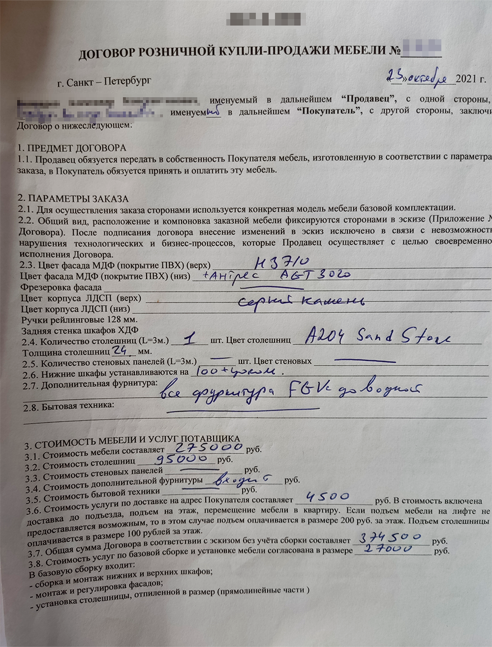 Мы подписали с мастером договор, и я внес предоплату — 200 000 Р. Мастер обещал сделать кухню за шесть недель, к середине декабря 2021 года. В это время мы решили купить технику.