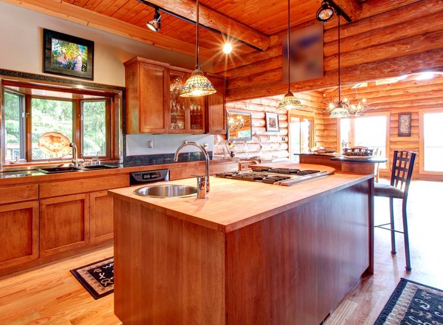 Если упор делается на экологичность и максимальную приближенность кухни к деревенскому укладу, дерево – самый подходящий отделочный материал как для мебели, так и для пола, стен, оконных рам.