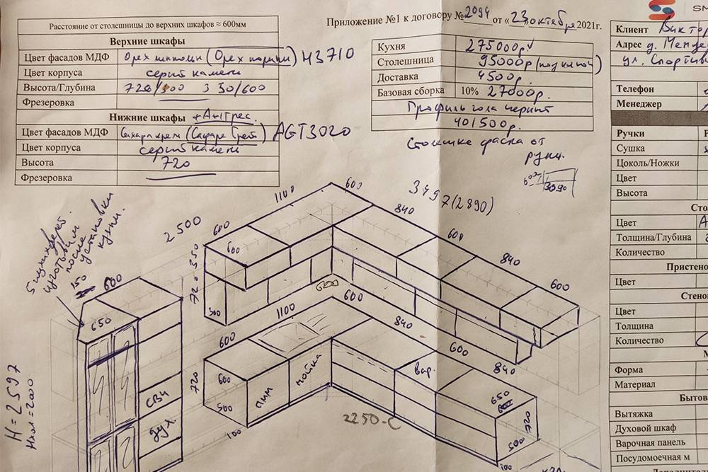 Мы объяснили мастеру, где и какая будет техника. Он сделал замеры, рассчитал высоту и ширину всех элементов и начертил эскиз кухни.